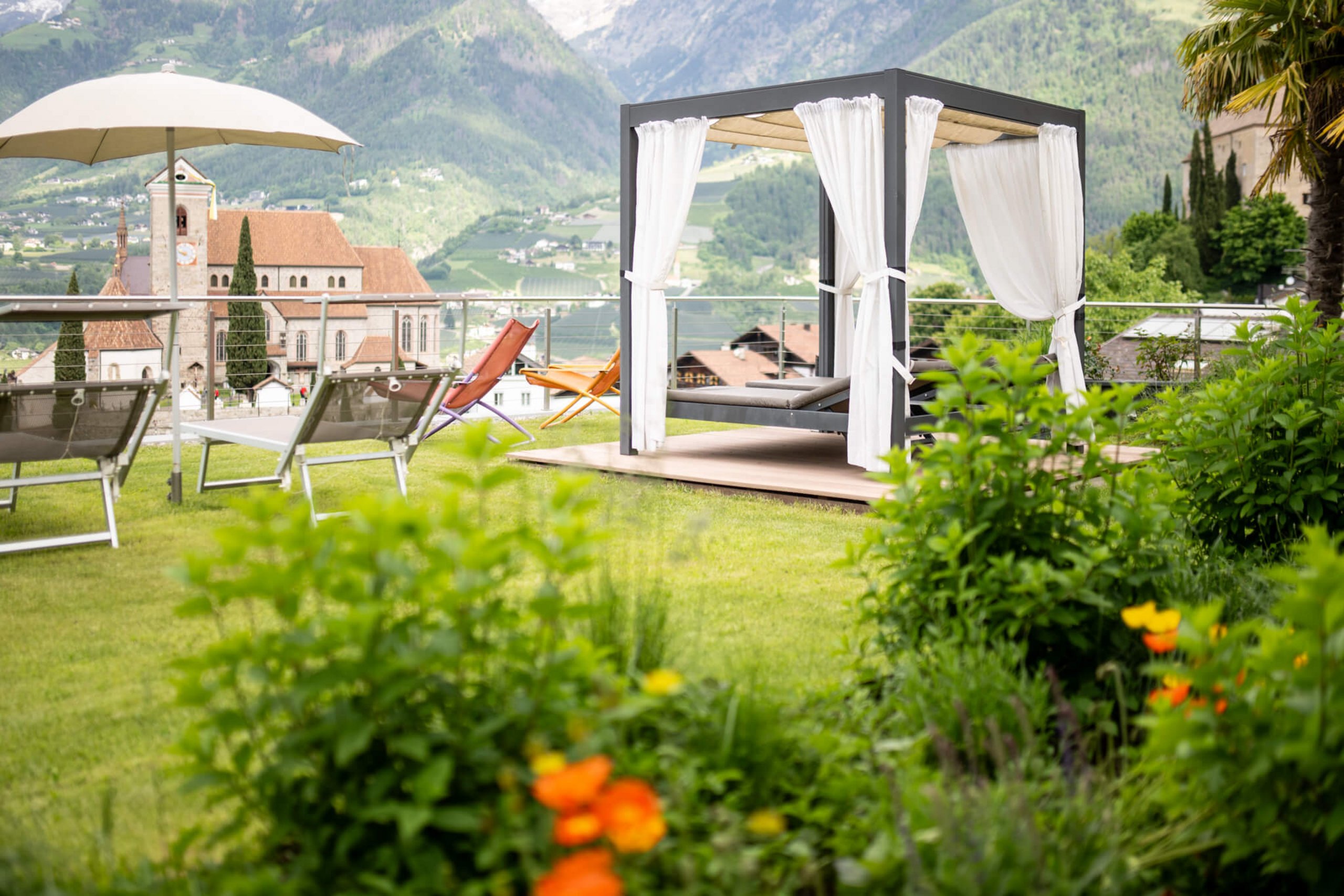 Modernes, elegantes Zimmer im 2. oder 3. Stock mit Blick auf das Dorf und das Meraner Land. Es verfügt über ein Kingsize-Bett, das getrennt werden kann, ein Einzelschlafsofa, eine gemütliche Chaiselongue, eine Sitzecke, einen Balkon und ein Badezimmer mit Badewanne und Dusche. Zudem ist das Zimmer mit zahlreichen Annehmlichkeiten, wie Safe, Minibar und Fernseher, ausgestattet.