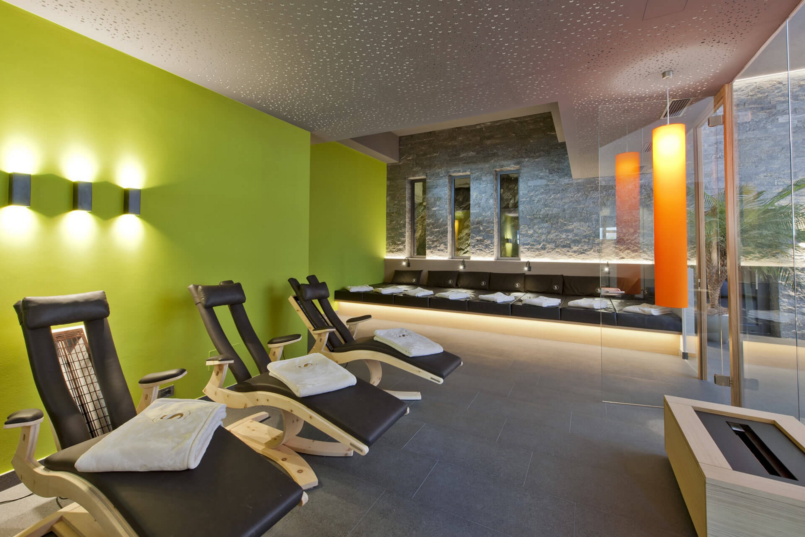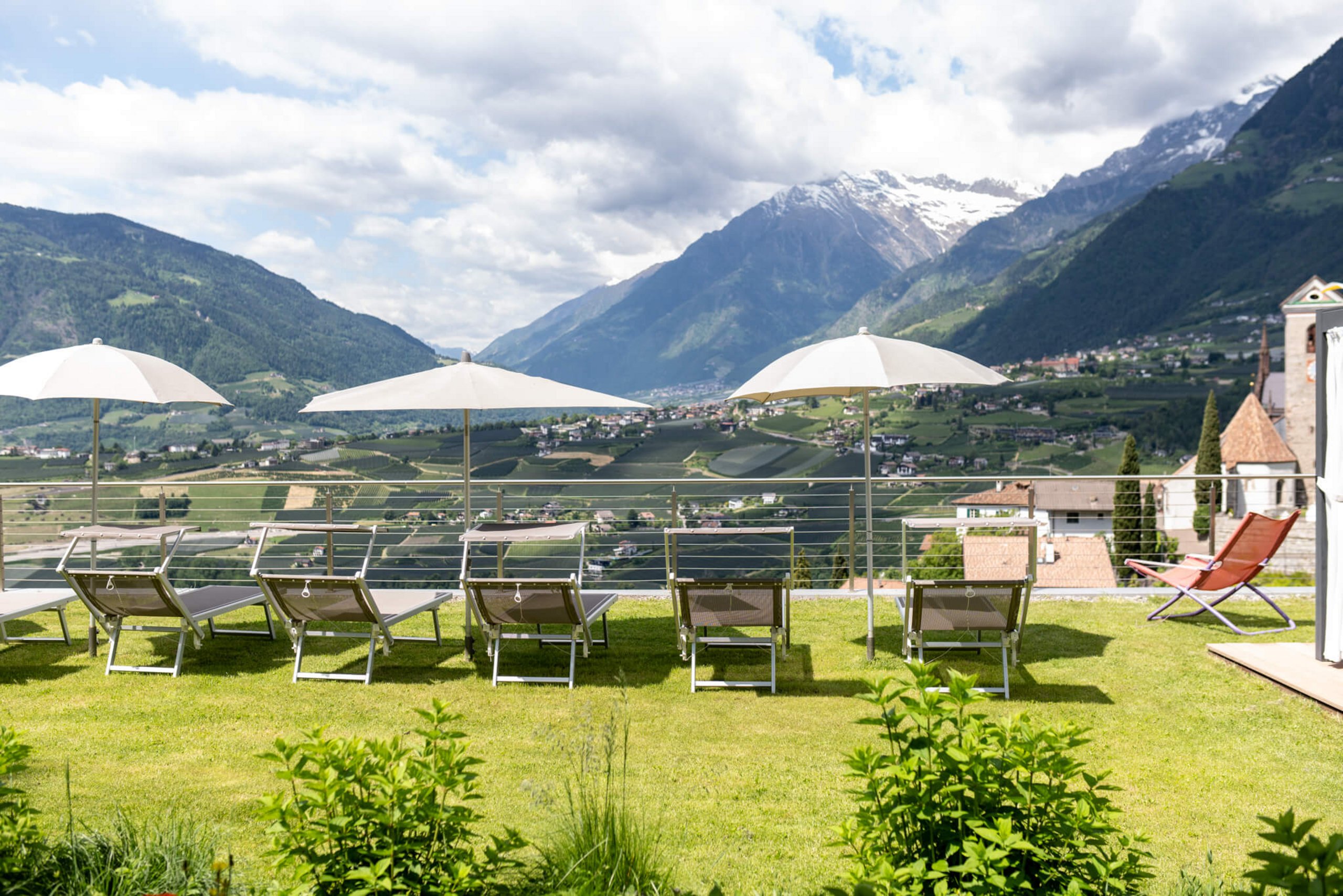 Neue Doppelzimmer mit großer Terrasse zur Südseite und grandiosem Blick über das gesamte Meraner Land, geräumiges Bad mit viel Ablagefläche, WC und Bidet, Soft-Rain-Dusche, Föhn, SAT-TV, Telefon, Safe, Tiroler Sitzecke, Lounge-Couch, Minibar und separater Schlafraum für die Kinder. Klimatisiert von Juni bis September.
