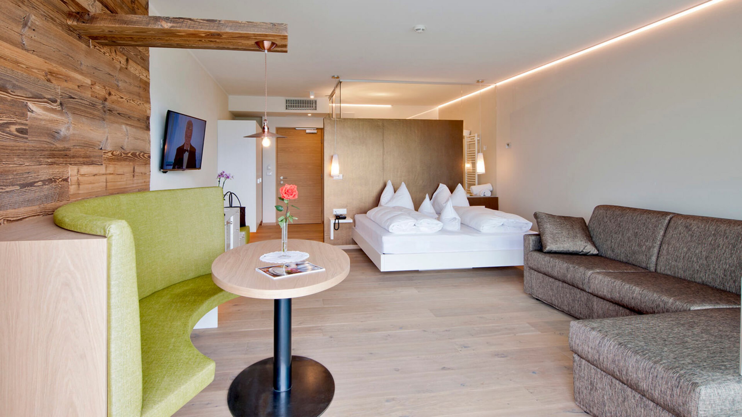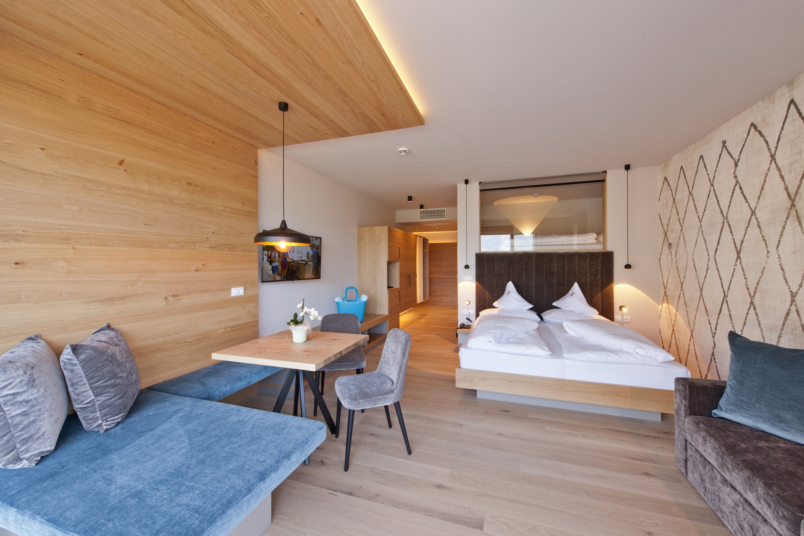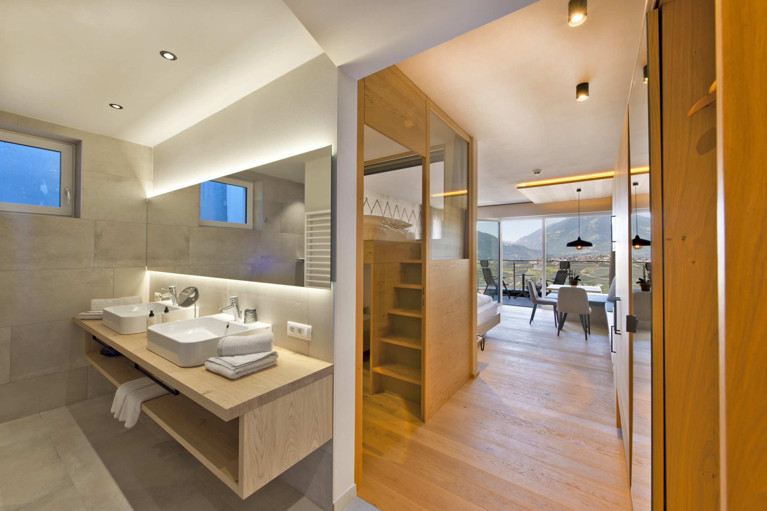 Geräumige, mit hellem Holz eingerichtete Suite im 3. Stock mit herrlichem Panoramablick auf das Dorf und das Meraner Land. Der Schlafbereich ist durch eine mobile Trennwand vom Wohnbereich abgegrenzt. Die Suite ist barrierefrei und verfügt über ein Kingsize-Bett, zwei ausziehbare Doppelschlafsofas, eine gemütliche Sitzecke, einen Schreibtisch, einen Balkon, ein Badezimmer mit Badewanne und eine separate Dusche. Zudem ist die Suite mit zahlreichen Annehmlichkeiten, wie Safe, Minibar und Fernseher, ausgestattet.