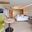 Gemütliche, mit hellem Holz eingerichtete Suite im 3. oder 4. Stock mit Blick auf die Berge und das Meraner Land. Sie verfügt über ein Kingsize-Bett, ein ausziehbares Doppelschlafsofa, eine gemütliche Sitzecke, einen Schreibtisch, einen Balkon und ein großes Badezimmer mit Dusche und Badewanne. Zudem ist die Suite mit zahlreichen Annehmlichkeiten, wie Safe, Minibar und Fernseher, ausgestattet.